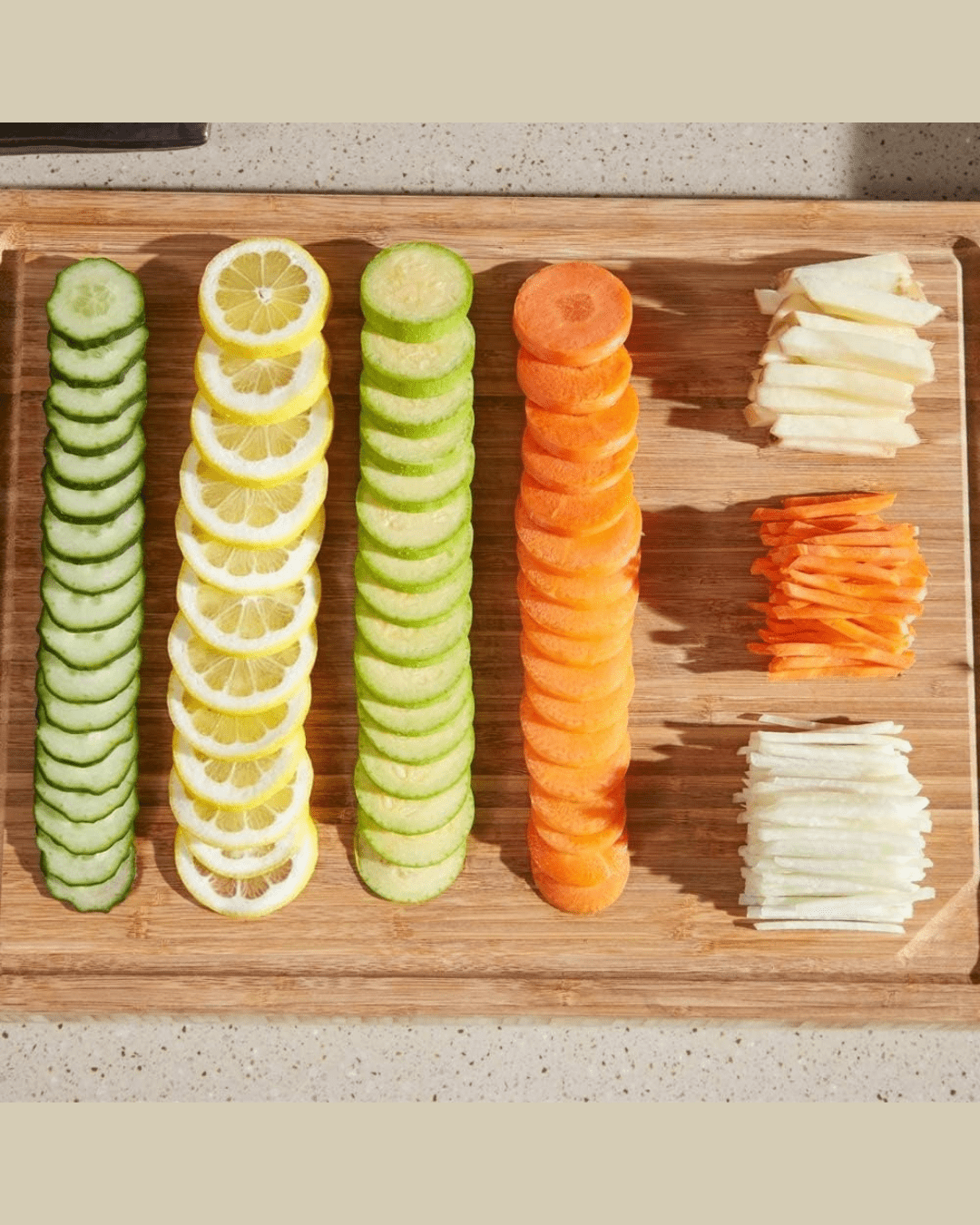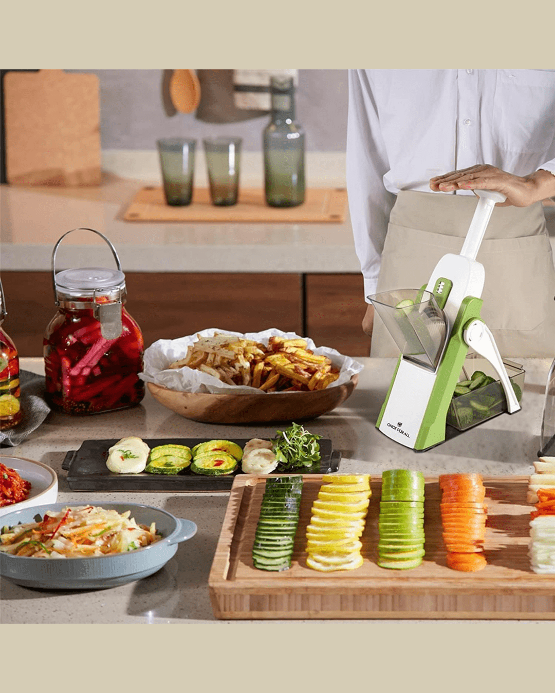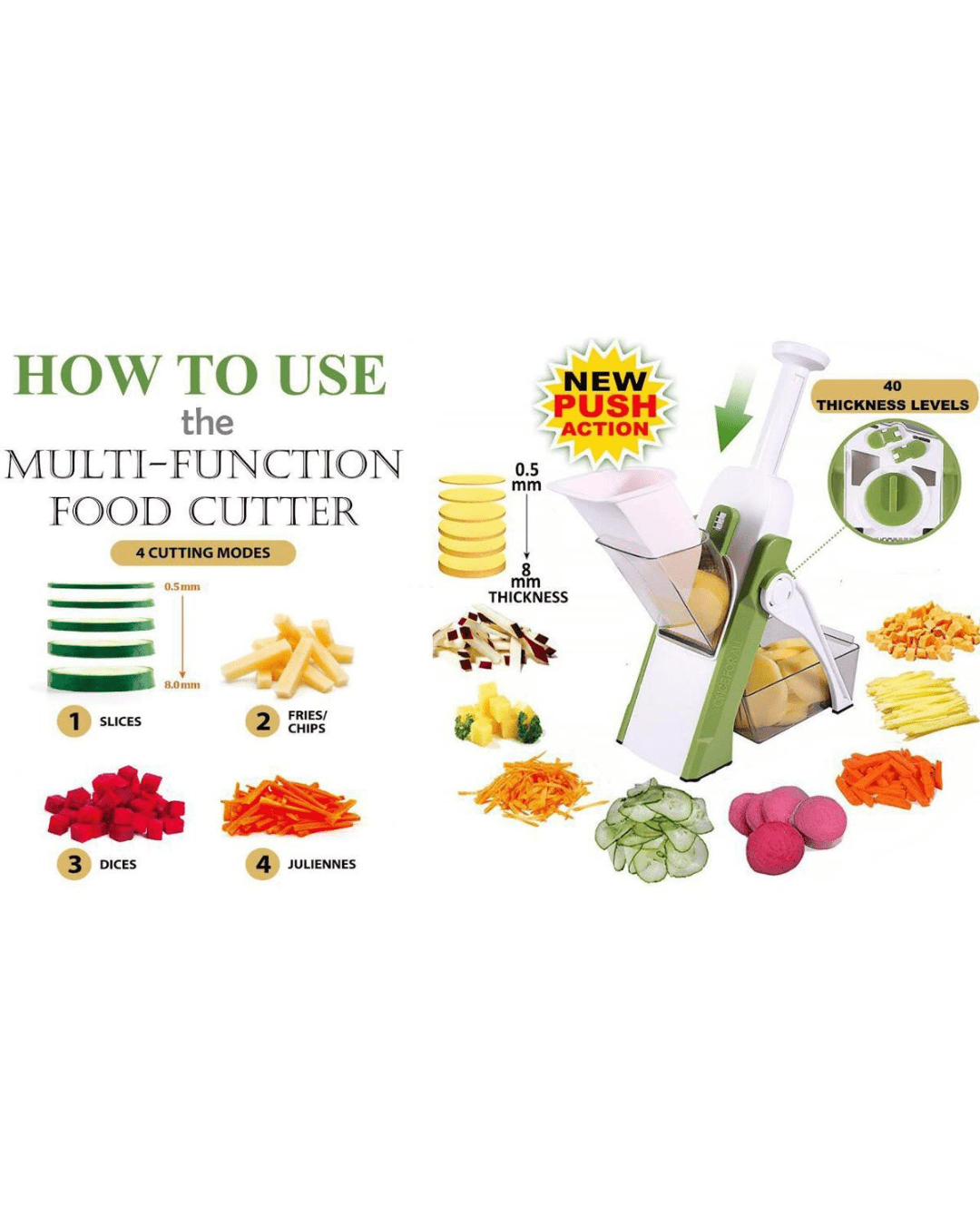 Convenience and Versatility: Its a all? in? one safe adjustable mandoline slicer. This mandoline slice no need to change blades, only by rotating the regulators and pressing the handle, you can adjust and cut various vegetables and fruits into a unique shape and thickness(0.5mm to 8mm) that best suit your desire, such as slices, strips, julienne, and dices. No tedious cleaning work, you can rinse it by water.