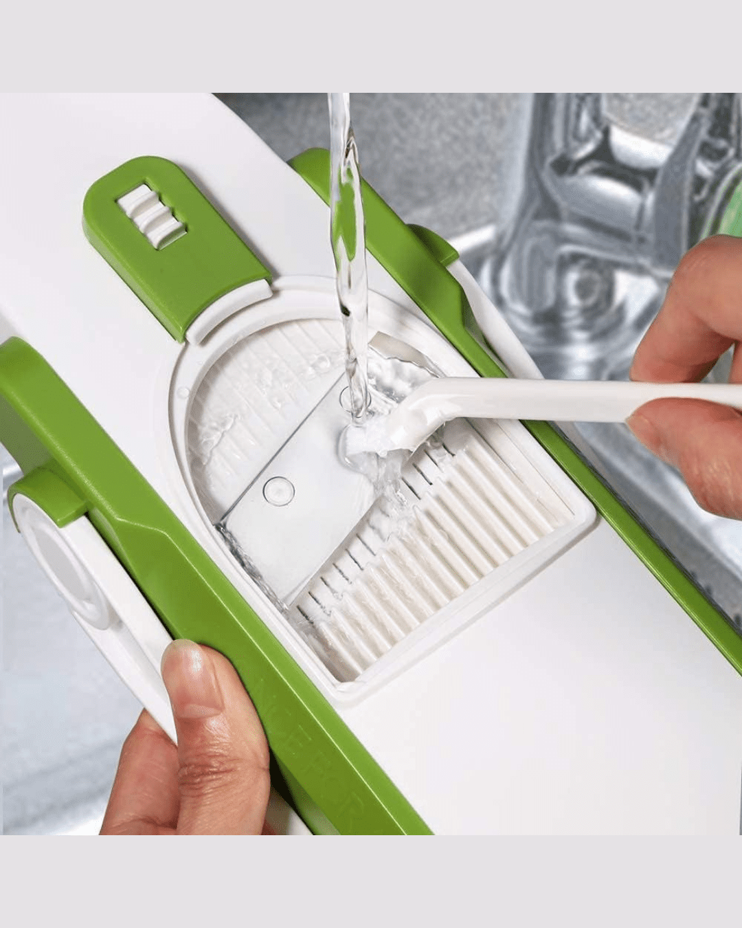 Safety: This safe adjustable mandoline slicer have hide blades and stability brought by the suctions under it make it more safe. Warning! Do not touch the blades in any circumstance! Please use the brush we provided to clean the blades
