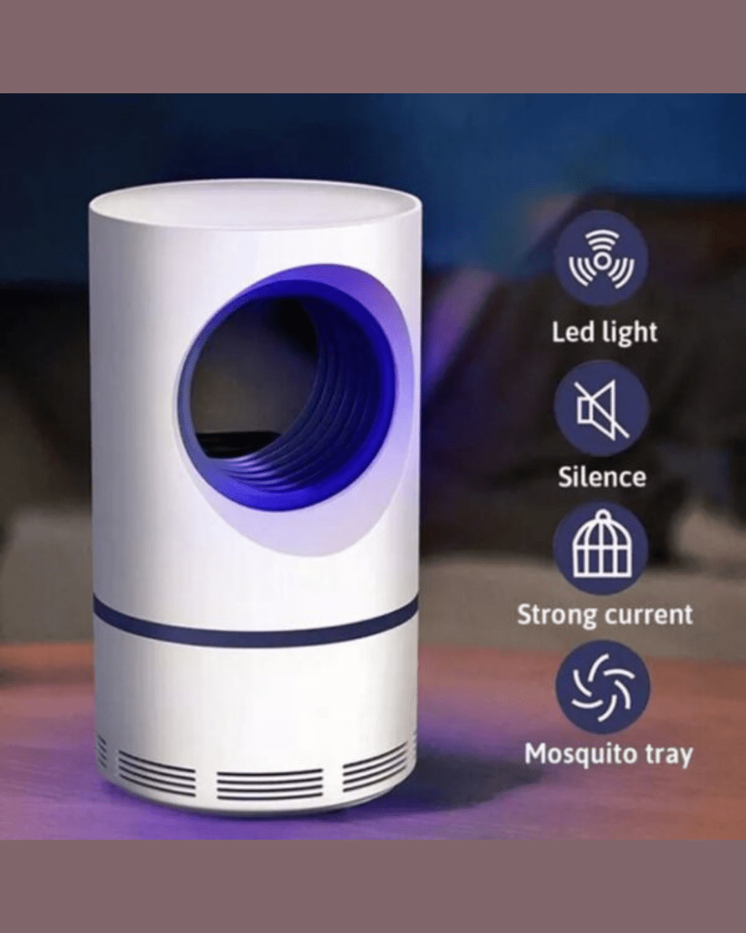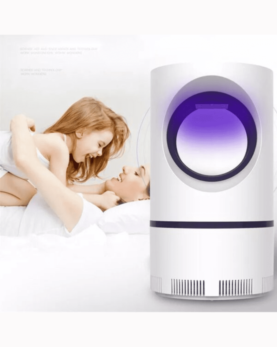 - UV lamp and suction fan: Adopted physical principle, special ultraviolet LED attracts mosquito, and this device encloses the mosquitos inside until death.